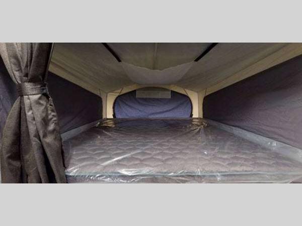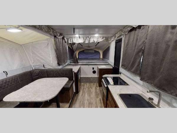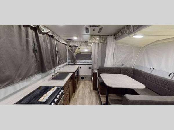 Your family of five or six can enjoy camping above ground in this camper with two tent end beds giving you more interior floor space and a slide out U-shaped dinette. The cook will love having the choice of making meals inside with full amenities including a three-way refrigerator or outside on the slide out kitchen and griddle. And you can dine under the 13' awning or back inside at the dinette. You will find plenty of storage in the cabinets and the shower/cassette toilet with curtain offer a wet bath to stay refreshed the whole trip.