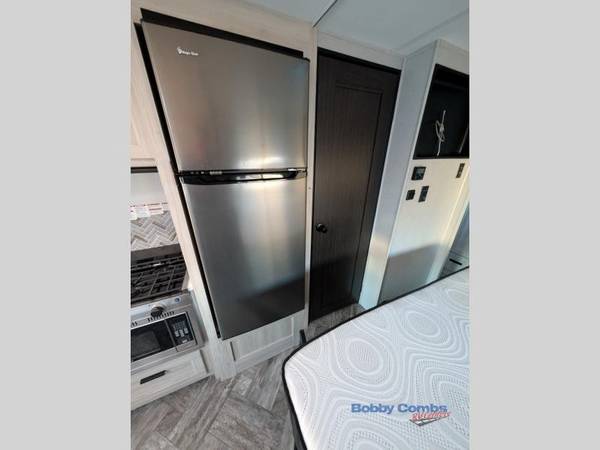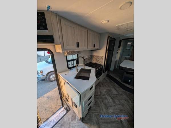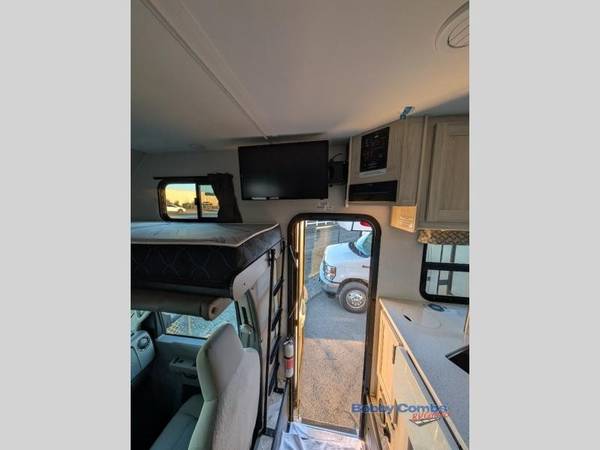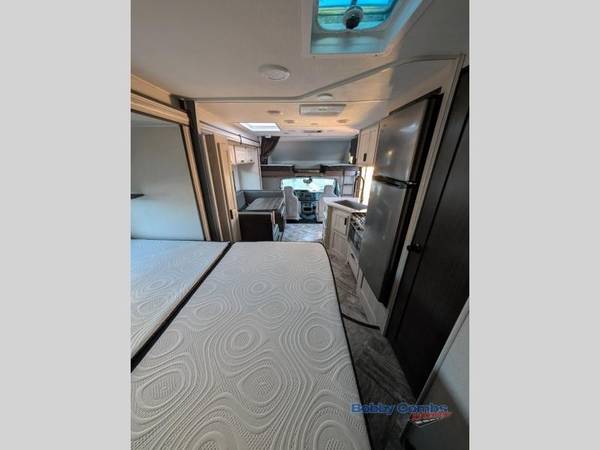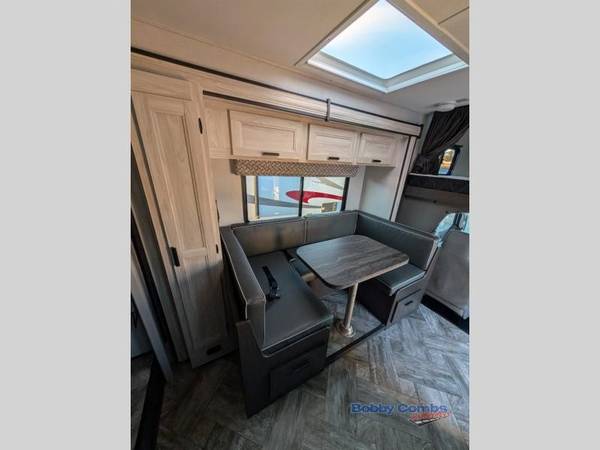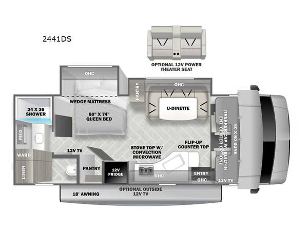 You will feel right at home traveling in this motorhome! The full rear bathroom has a 24" x 36" shower to freshen up in, plus storage space and a private toilet so you both can use this room at once. Inside the bedroom is a 60" x 74" queen bed slide for more space, and a 12V TV for movies in bed. Prepare your best meals with the three burner cooktop and the 10.7 cu. ft. 12V refrigerator or throw some leftovers in the undermount 1.3 cu. ft. convection microwave then enjoy it at the U-shaped dinette slide. The 60" x 80" bunk over cab mat offers a comfortable place to sleep but if you don't need the extra sleeping space, you can switch it out for the optional Trekker cap with a built-in entertainment center, plus there is an optional outside 12V TV to add!