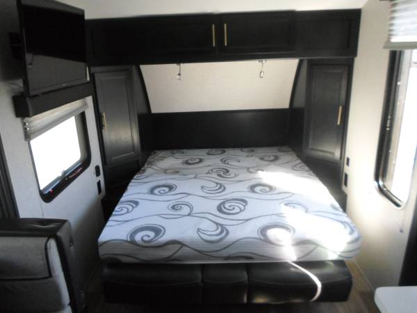 M-16PF Features 1 Slide Out, Roof Air Conditioning, Solar Panels, 12V/110 Refrigerator, Outside Refrigerator, Outside BBQ Hook Up, Furnace, Electric Awning, Electric Hitch Lift, Gas and Electric Water Heater, Stereo, 32" Flatscreen TV, Monitoring Panel, Microwave, Spare Tire and Stabilizer Jacks.