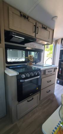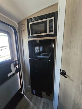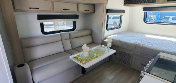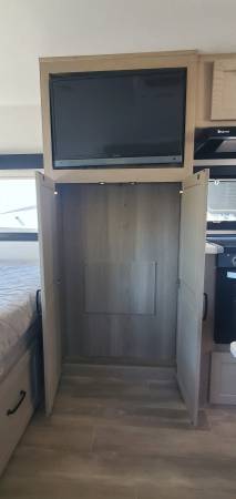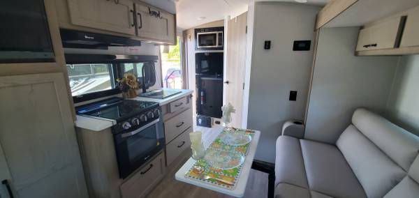 The kitchen is roomy with a large stainless sink and plenty of countertop! A 3-burner cook top with a large oven, microwave above, Double Door Refrigerator and tons of storage to top it off. The Sofa is the perfect size when relaxing indoors on those rainy Oregon days measuring 72" long, and the removable dinette option is perfect for a meal for 2. The sofa easily converts to a sleeper when needed for additional guests. You'll appreciate the roller shades throughout and large bay windows make for a great view, and a large Flat Screen is perfectly placed for watching the game or your favorite movies!
