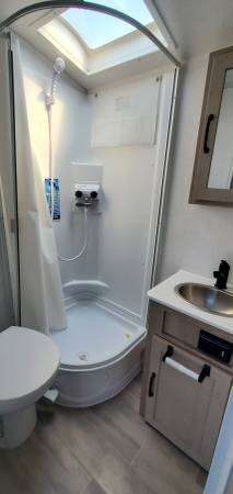 Snuggle up at night in your Residential sized Queen bed with a drawers below and the wardrobe closet just beside. There's additional overhead storage above, and outlets for all of your devices. The rear bathroom is an all-in-one and features a full glass shower, complete with Medicine cabinet, sink and porcelain commode and roomy enough to be able to move around change clothes comfortably. Simple yet elegant and practical for the weekend get-a-ways!