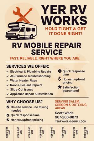 Yer RV Works provides prompt hassle free on site RV repair services for ALL aspects of your motorhome, 5th wheel or travel trailer. Everything from changing your a/c or water filter to complete collision or water damage restoration. Furnace, a/c, fridge or water pump not working? Slide out or awning wont come in when asked? Need your roof, windows, moldings, resealed or just cleaned or inspected? Need new slide seals, motor or new floor? Backed into the garage or didn’t quite make it out of the gas station without bumping into something? Motor or generator need a tune up or check engine light on? When’s the last time your axles and bearings were inspected? Head to Tow. We will make sure Yer RV Works!