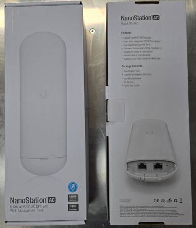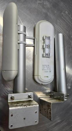 Long range WiFi bridge with pole mounts, works great to add fast WiFi to a remote location (barn, shed, detached garage, mother-in-law apartment, second office building), just needs fairly clear line of sight. Includes 2x 50' Cat 8 Ethernet cables and POE power supplies. UNMS ready. 5 Ghz airmax 450+ Mbps Other UniFi products for sale, see other ads.