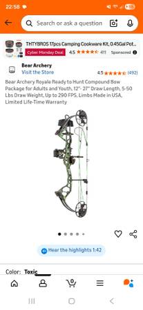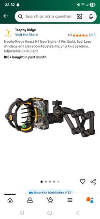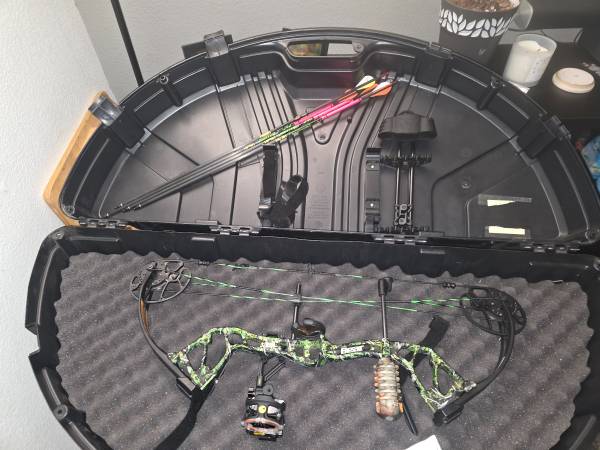 Great starter bow, my kid only shot it a couple times before he out grew it. It will need a new peep sight(cheap fix). Comes with front stabilizer, quiver, case, 4 arrows(cut to 26.5in) w/field points, pack of broadheads, 4 pin trophy ridge React(set the 20 yard pin and the other 2 auto adjust). $325 OBO.
