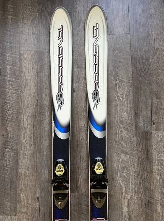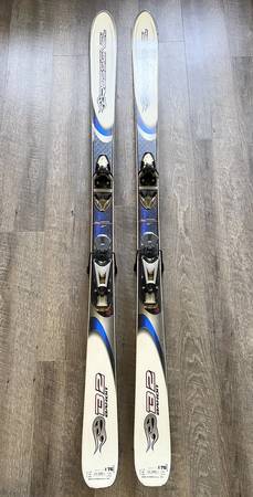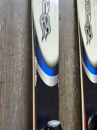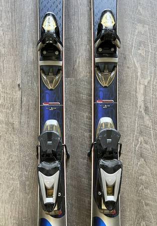 Used and in good condition overall. The tops of the skis have some surface scuffs/scratches and markings from previous use; there is no peeling or large defects in the top coat laminate, aside from one small region at the edge of the left tip. The bottom of the skis are in good shape - some mild/moderate scratches, but no large cuts requiring repair. The edges have some rust spots that can easily be buffed out. The skis come with Look bindings that are in great functional condition. SEE PHOTOS
