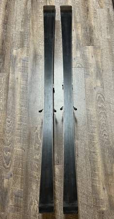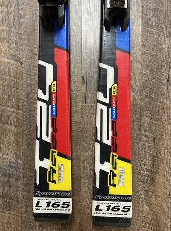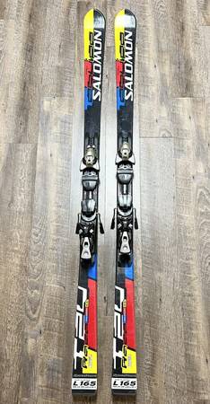 Used and in excellent condition overall. The tops of the skis have some surface scuffs/scratches and markings from previous use; there is no peeling or large defects in the top coat laminate. The bottom of the skis are in good shape - some mild/moderate scratches, but no large cuts requiring repair. The skis come with salomon bindings that are in great functional condition. SEE PHOTOS