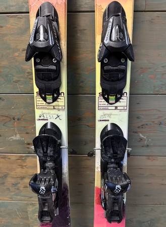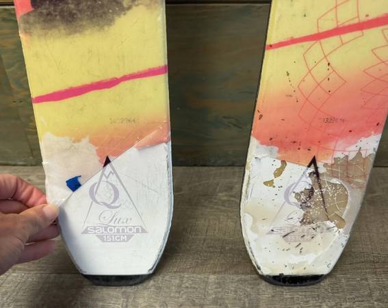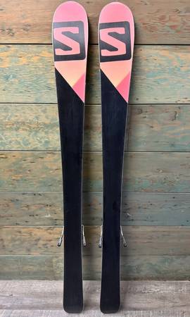 Used and in fair condition overall. The tops of the skis have some surface scuffs and markings from previous use; there are some large defects in the top coat laminate at the tail of each ski, carefully inspect photos. The bottom of the skis are in good shape - some mild/shallow scratches, but no large cuts requiring repair. The edges have some rust spots that can easily be buffed out. The skis come with Salomon bindings that are in great functional condition. SEE PHOTOS