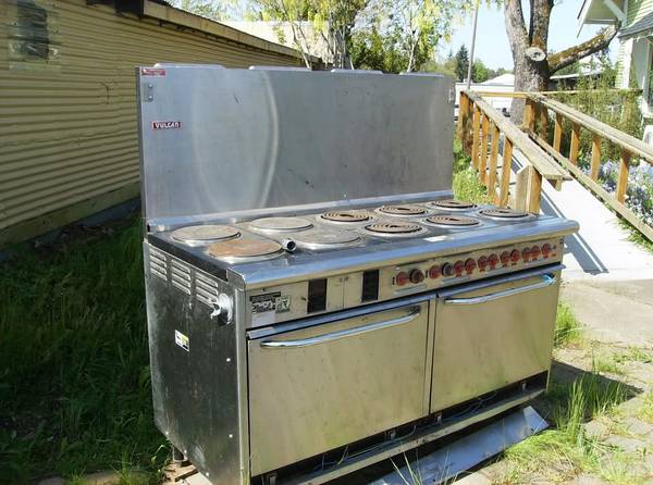 Vulcan 10 burner, two oven 60" electric range. Might need a fork lift and trailer to take home (or a bunch of buddies to lift it).