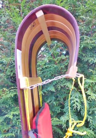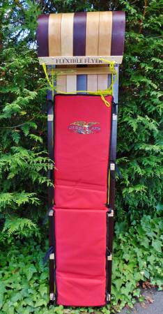 Flexible Flyer toboggan, with padded cushion. Model CL-6, wooden, made in Canada. Measures 72 inches long by 16.5 inches wide. Lightly used, has some scratches on the bottom, but otherwise in very...