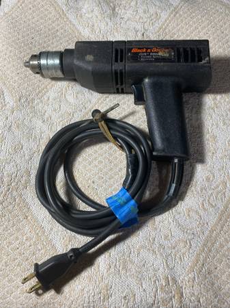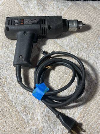 Black & Decker variable speeds forward and reverse with chuck key. 115 volts with 2.2 amps turning at 0-1200 rpm, double insulated. Works great !