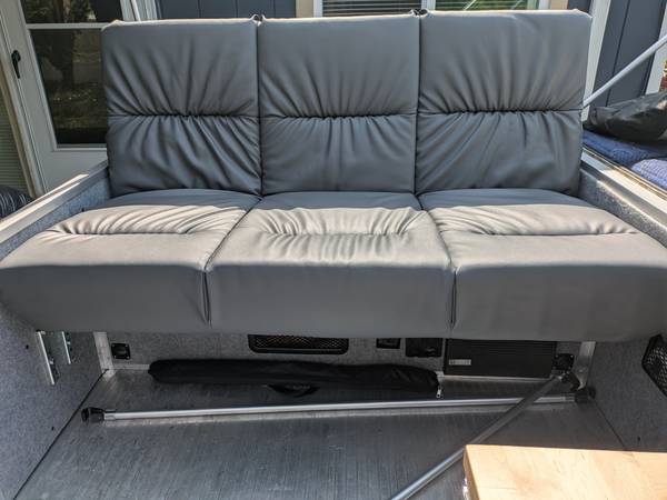 Brand new from superior seating. Will not work for my project. 56" wide. Bottom is 22" deep. Back is 20" tall. Steel hardware. Will work great in a larger RV, van, bus etc. "Honda grey" vinyl.