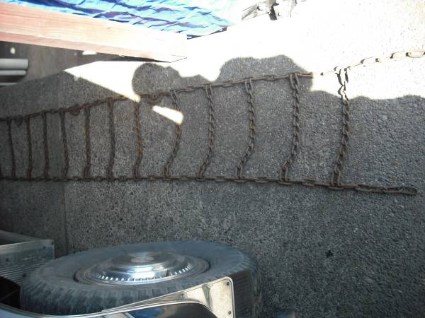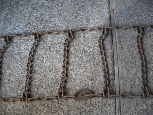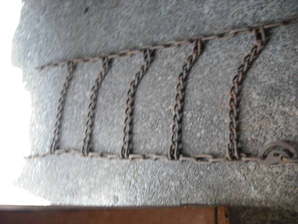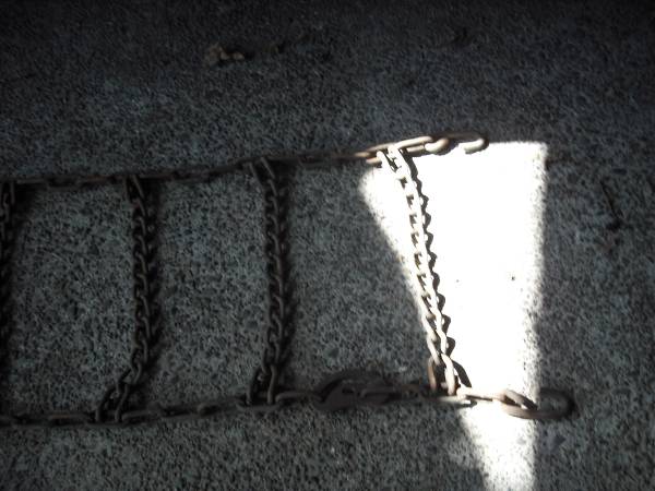 Standard truck tire chain. 10'- 2" long. 1'- 4" wide. Cam tighteners.