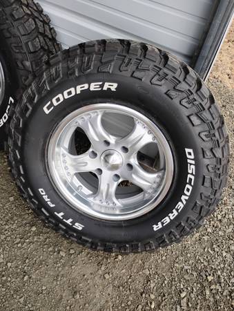 Set of like new cooper discover sst 10 ply tires on new Toyota trd aluminum wheels. 265/75/16 inch tire. Have 500 miles on them. No trades .best if call. .