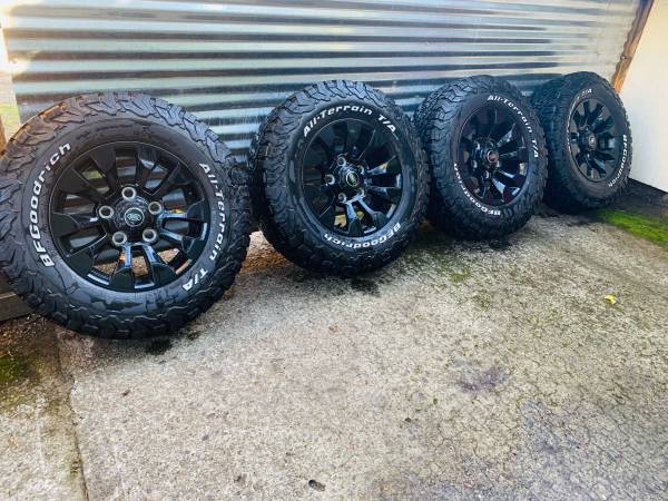 Hi, I’m selling my 18x9” sawtooth wheels that came off my Land Rover Defender 110. The manufacture code on the tires are May of 2018 and they’ve probably only got 5k miles on them so they still have some life in them. The tires are BFG KO2 275/70R18. I new set of wheels will set you back $1100-1200 and comparable tires are about the same as well. I have a set of 30mm spacers which would also go for about $200-300 which will go with the wheels. I just finished cleaning them so I got 95% of the brake dust off of them.