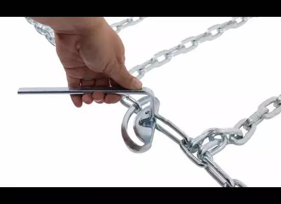 Cam Assisted Tensioning: These traction chains are supplied with built-in Cam tensioners and a Cam tensioning tool for easy, quick, and secure tensioning of the tire chain to the tire.